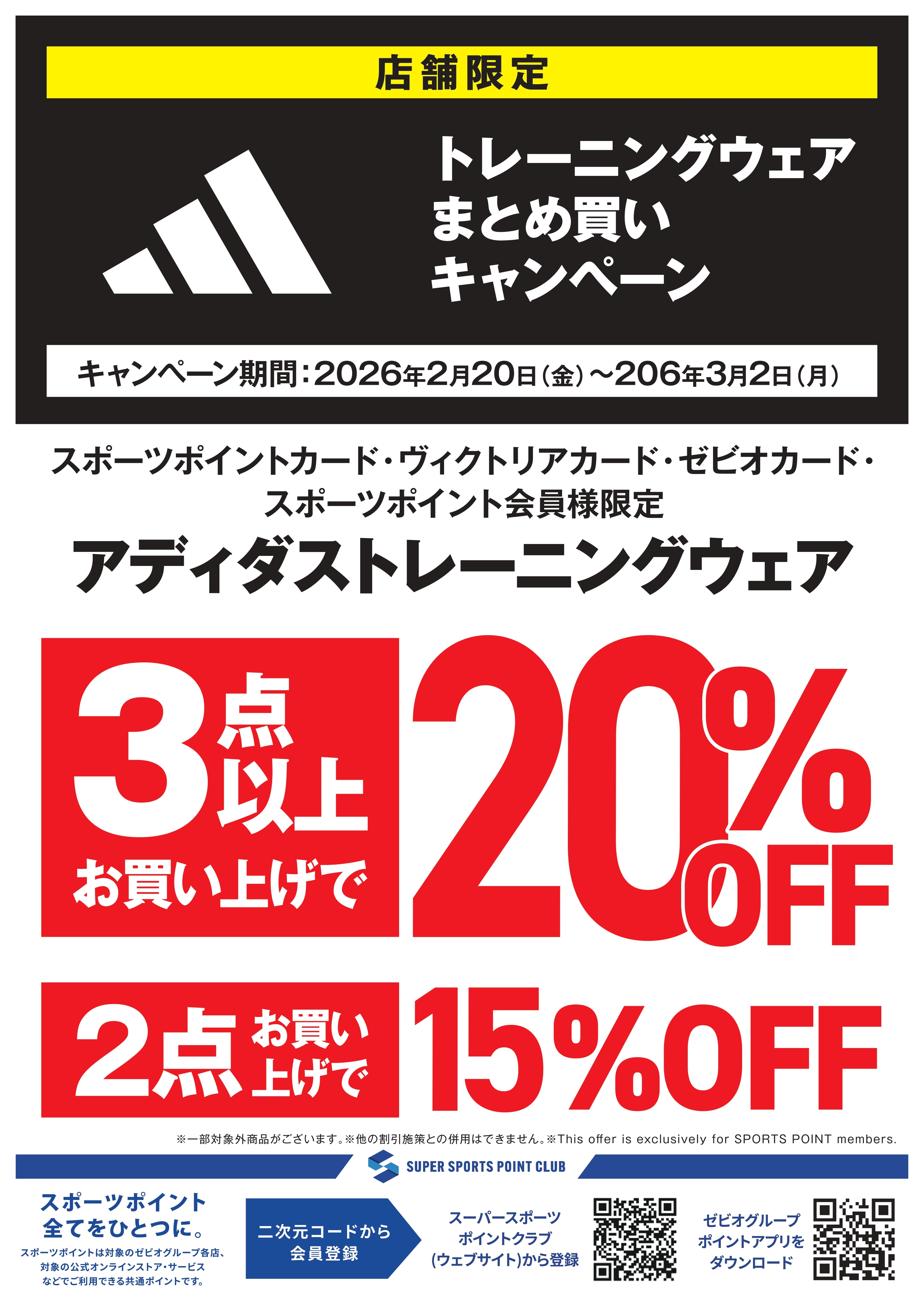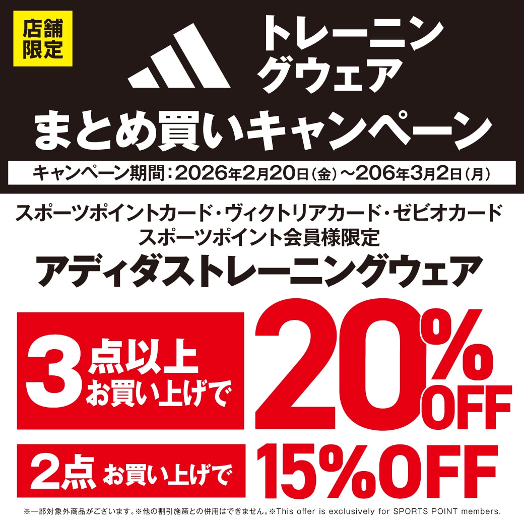 2月20日(金)~3月2日(月)までの 期間中、アディダストレーニングウェア をまとめてご購入いただくと 同時購入点数により レジにて割引させていただきます。 2点ご購入で15%OFF 3点以上ご購入で20%OFF ■対象商品 ・アパレルウェア ・スポーツウェア ※一部対象外商品がございます ※オンラインストアは対象外となります スポーツポイントカード・ヴィクトリアカード・ ゼビオカード・スポーツポイント会員様 限定の施策となります。 当日入会もOK。無料でご登録いただけます。 詳しくは店舗ナビゲーターまで お問合せください。