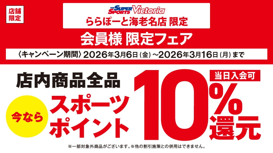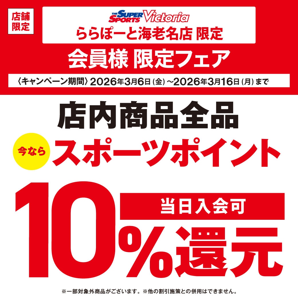 3月6日(金)~3月16日(月)までの期間中、 SUPER SPORTS Victoria ららぽーと海老名店 のリニューアルOPENを記念して、 店内商品全品 スポーツポイント最大10%還元 させていただきます。 ■ポイント還元詳細 ・カード支払いで100円につき10ポイント還元 ・現金支払いで100円につき10ポイント還元 ・その他の支払いで200円につき20ポイント還元 ※スポーツポイントカード、ゼビオカード、ヴィクトリアカード、スポーツポイントデジタル会員画面のご提示が必要です。 ※オンラインストアは対象外となります 当日入会もOK。無料でご登録いただけます。 詳しくは店舗ナビゲーターまで お問合せください。