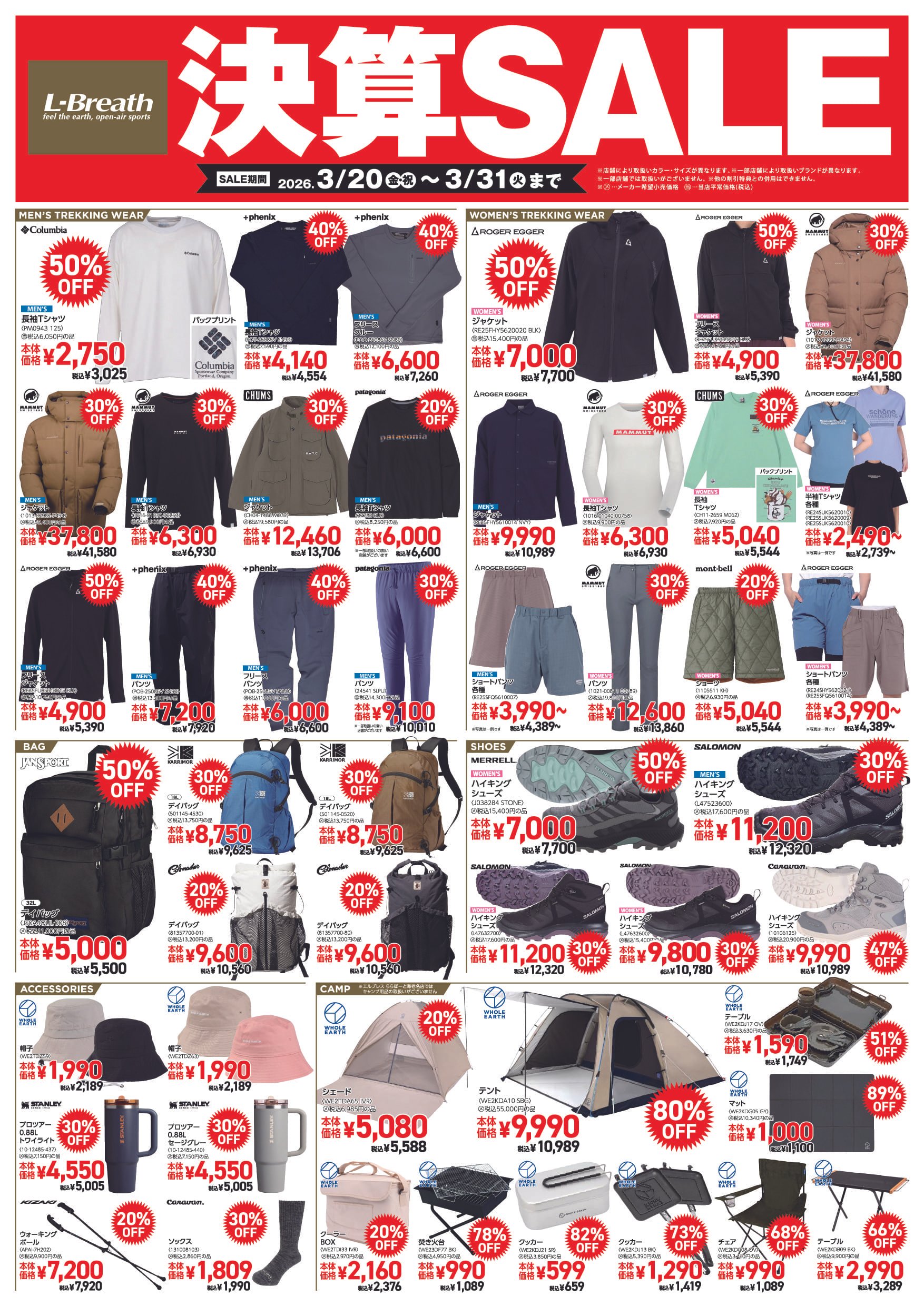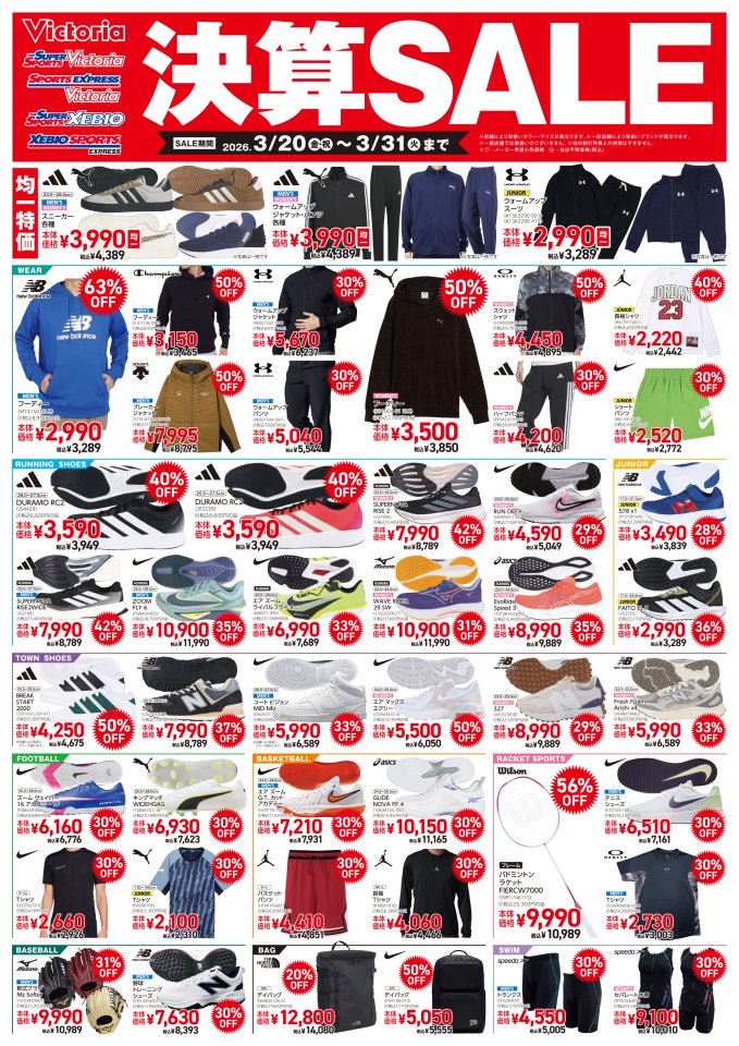 3月20日(金・祝)~3月31日(火)まで 年に一度の【決算SALE】がスタートいたします! 3月31日(火)までの期間中、 店内商品が驚きの決算特価で勢揃いいたします。 ※オンラインストアは対象外です。 ※店舗によって取扱商品は異なります。 ※詳しい取扱商品に関しては店舗まで お問い合わせください。