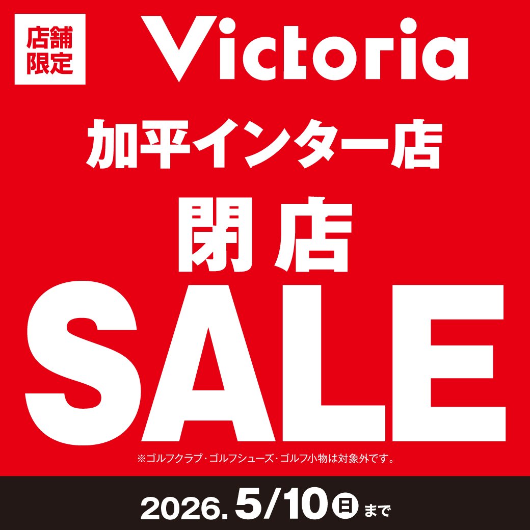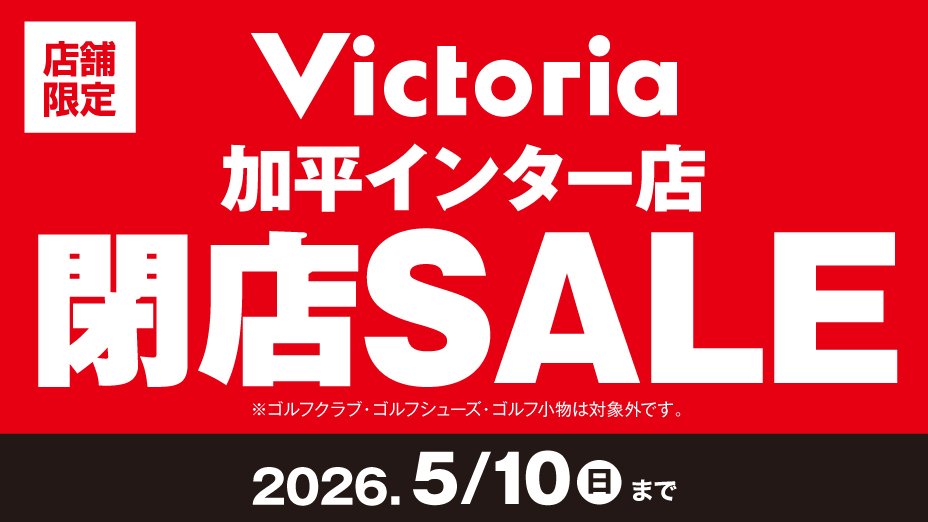 1994年の開店以来、 約31年間という長きにわたり、 地域の皆様のスポーツライフを 応援させていただきました。 これまで多くのスポーツファンの皆様に 支えられ、営業を続けてこられましたことを、 スタッフ一同心より感謝申し上げます。 誠に勝手ながら、Victoria加平インター店は 5月10日(日)をもちまして閉店いたします。 これまでの感謝を込めまして、 4月10日(金)より「閉店SALE」を 開催いたします。 在庫限りの特別価格となりますので、 ぜひ最後に足をお運びいただけますと幸いです。 閉店後の各種サービスご案内情報は、 ページ下部に記載しております。