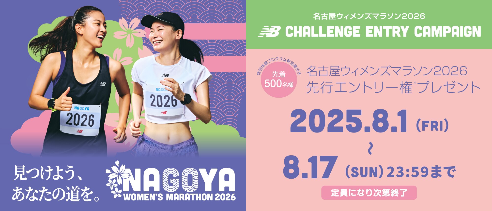 ※ 先行エントリー権は、一般のエントリーに先駆けて優先的に「名古屋ウィメンズマラソン2026」にエントリーできる権利です。参加料18,000円(税込)はお客様のご負担となります。指定期間内のエントリー登録、料金の振り込みを完了することで、出走権が確定となりますのでご注意ください。