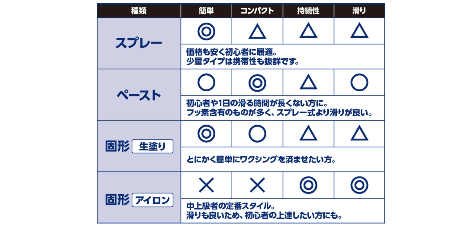 ワックスをかけることで、大事な板を長持ちさせ、滑りも良くなります。 滑る頻度や楽しみ方でワクシングの種類が変わります。