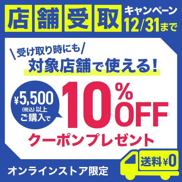 - キャンペーン期間中に公式オンラインストアで商品をご購入かつ「店舗受け取り」を選択された方に、対象店舗でご利用いただけるクーポンをプレゼント。