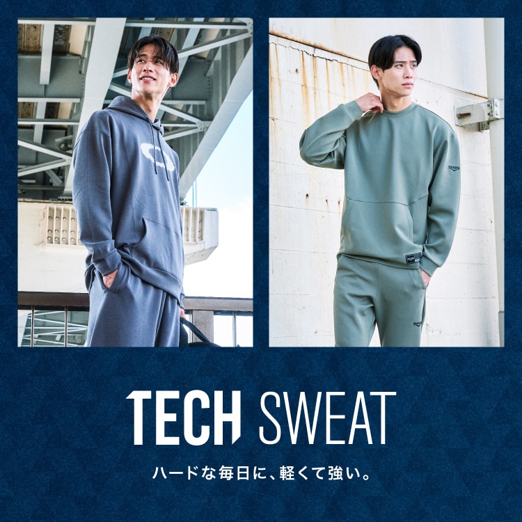 TECH SWEATは、ハードに動き続ける方たちのために生まれた高機能スウェット。軽量でハリのあるダンボール素材が、筋肉の動きを妨げず、オフの時間にもスマートな印象を保つ。