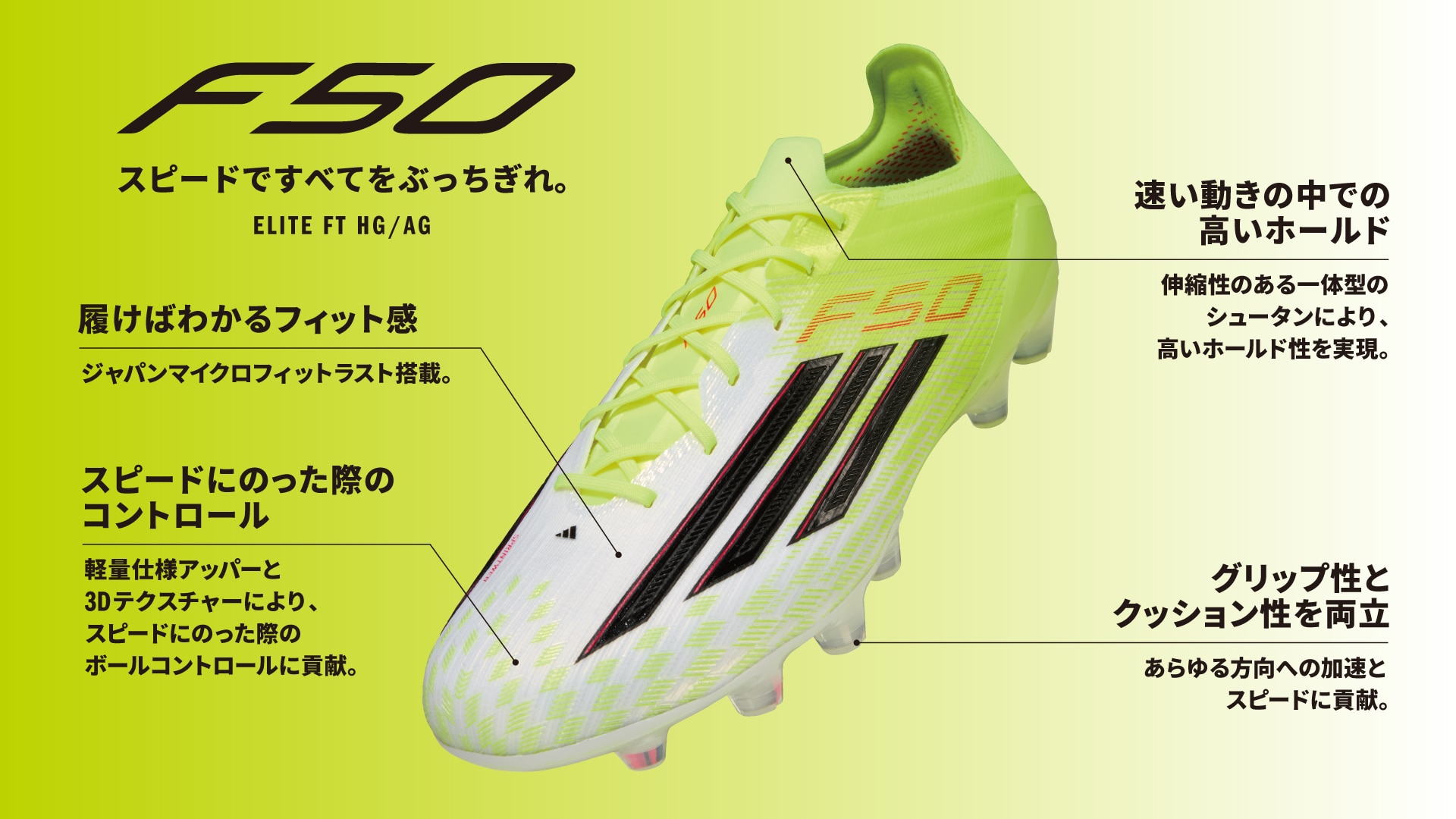 adidas F50 Eliteは、軽量なFIBERTOUCHアッパーとSPRINTWEBを採用し、