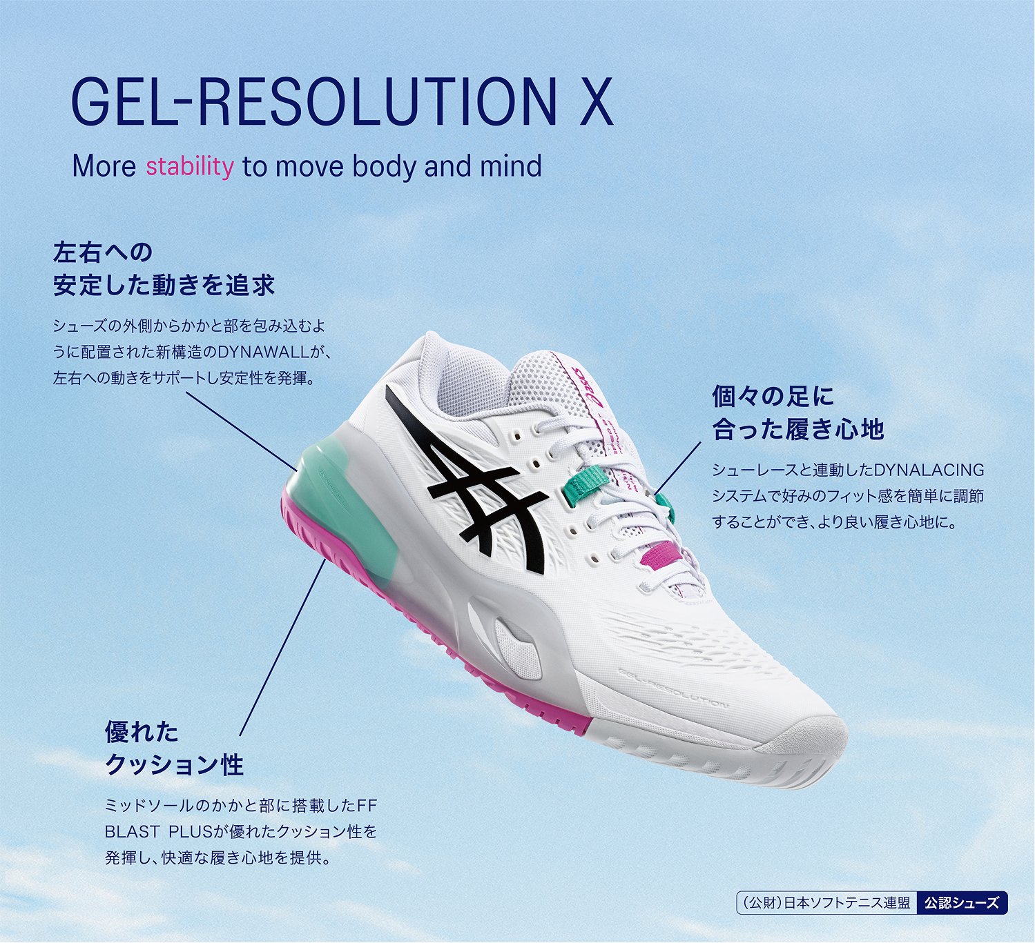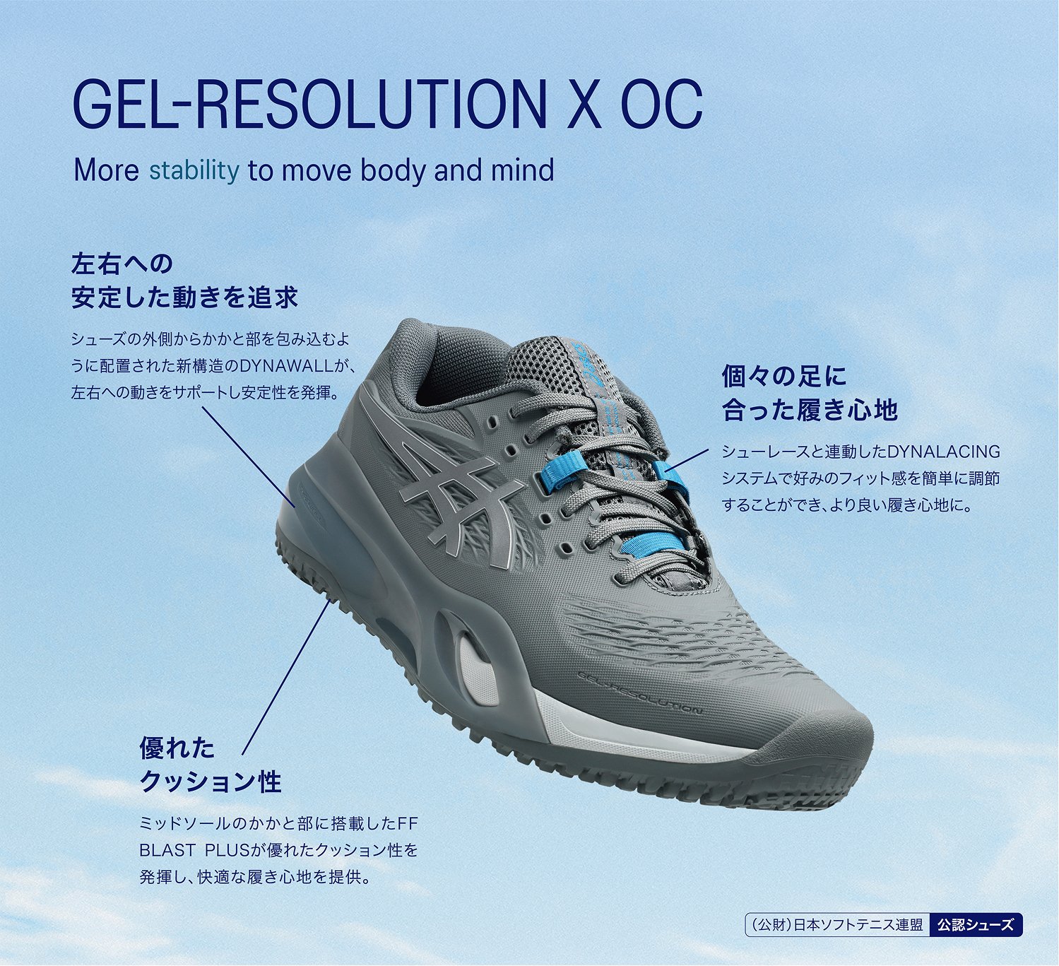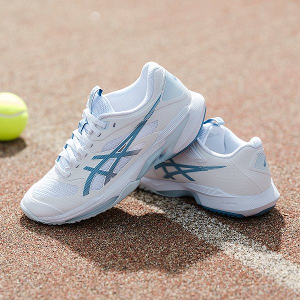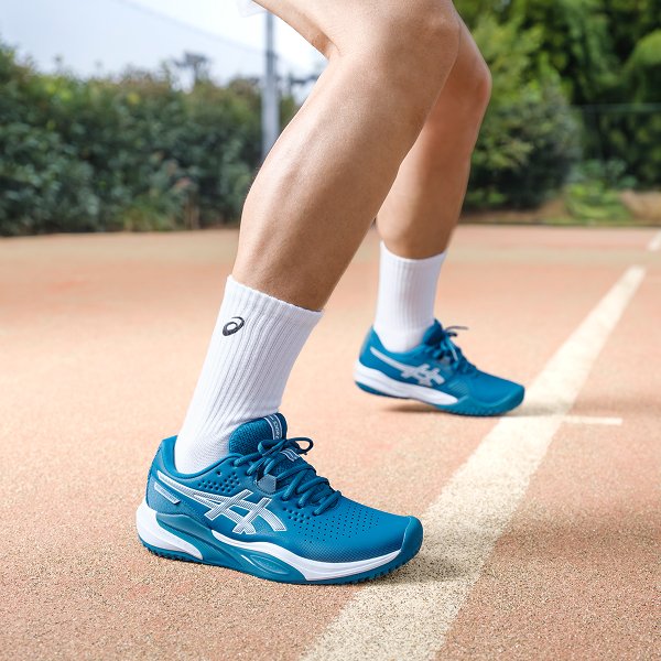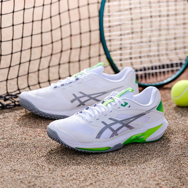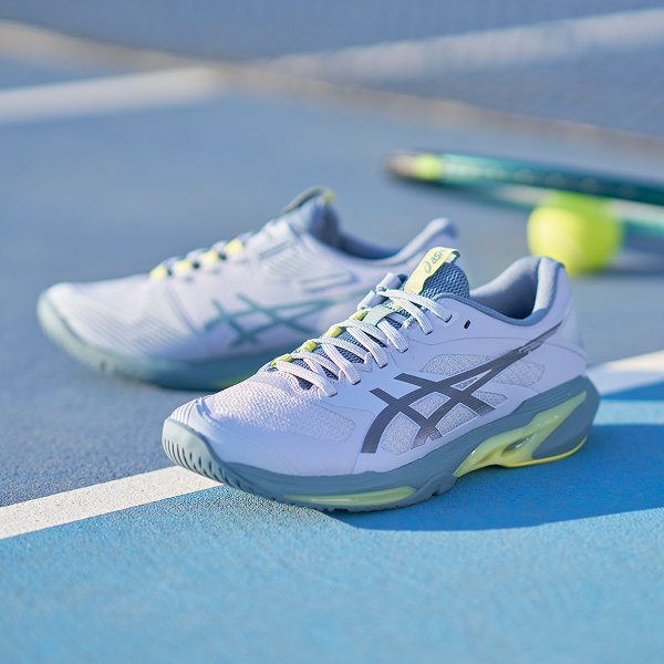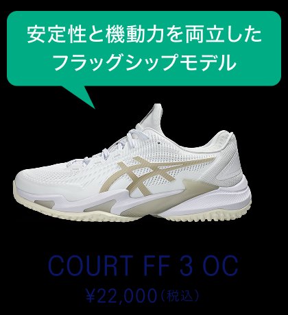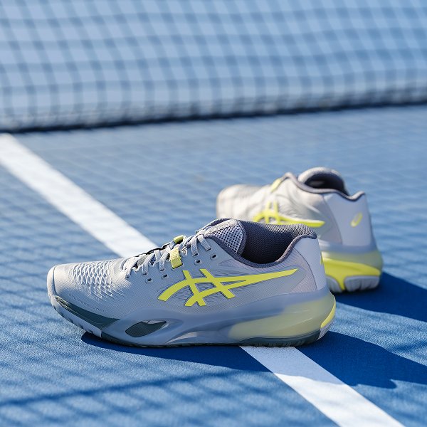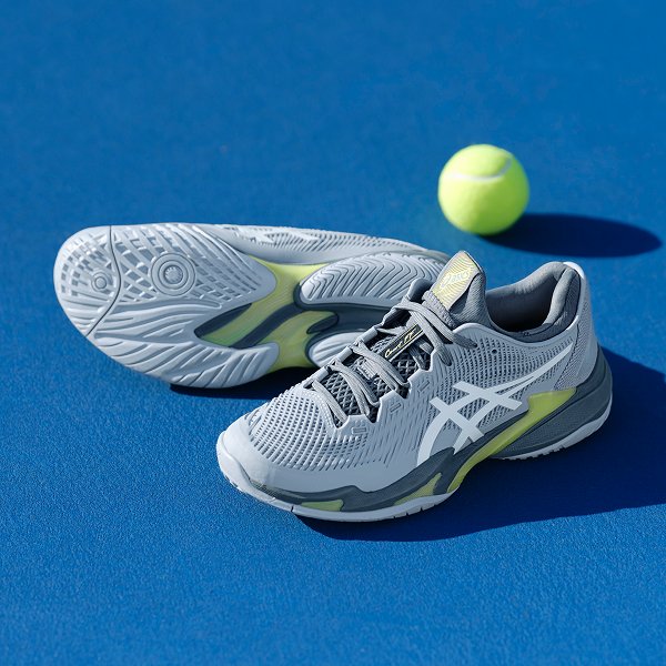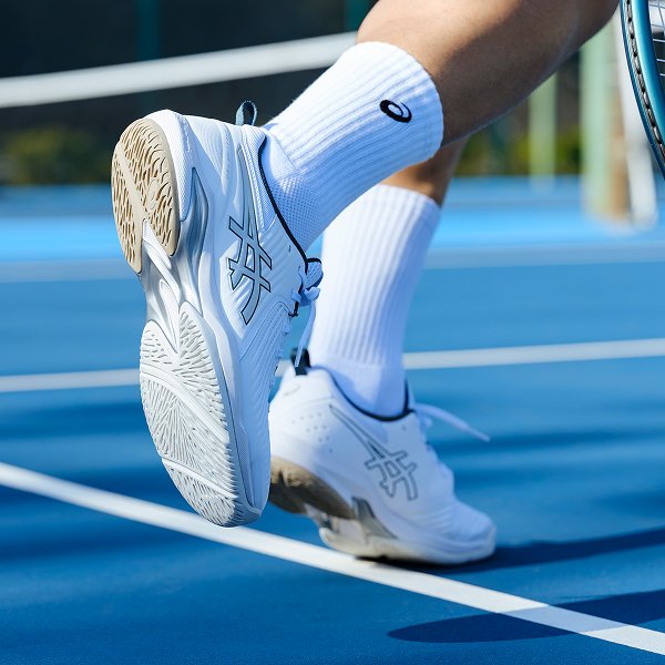 アシックスはテニスプレーヤーの動きを研究し、データをもとにテニスシューズやウエアを開発しています。アシックス独自のテクノロジーでプレーヤーをサポートし、テニスに必要な安定性やクッション性、グリップ性などを発揮します。