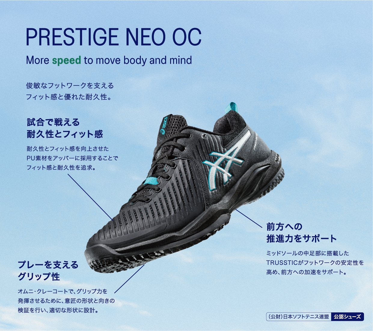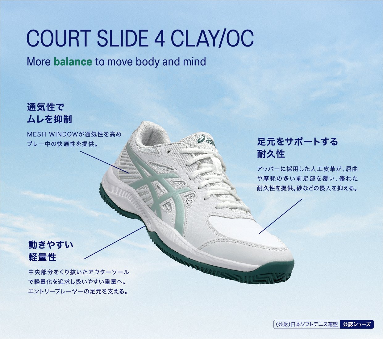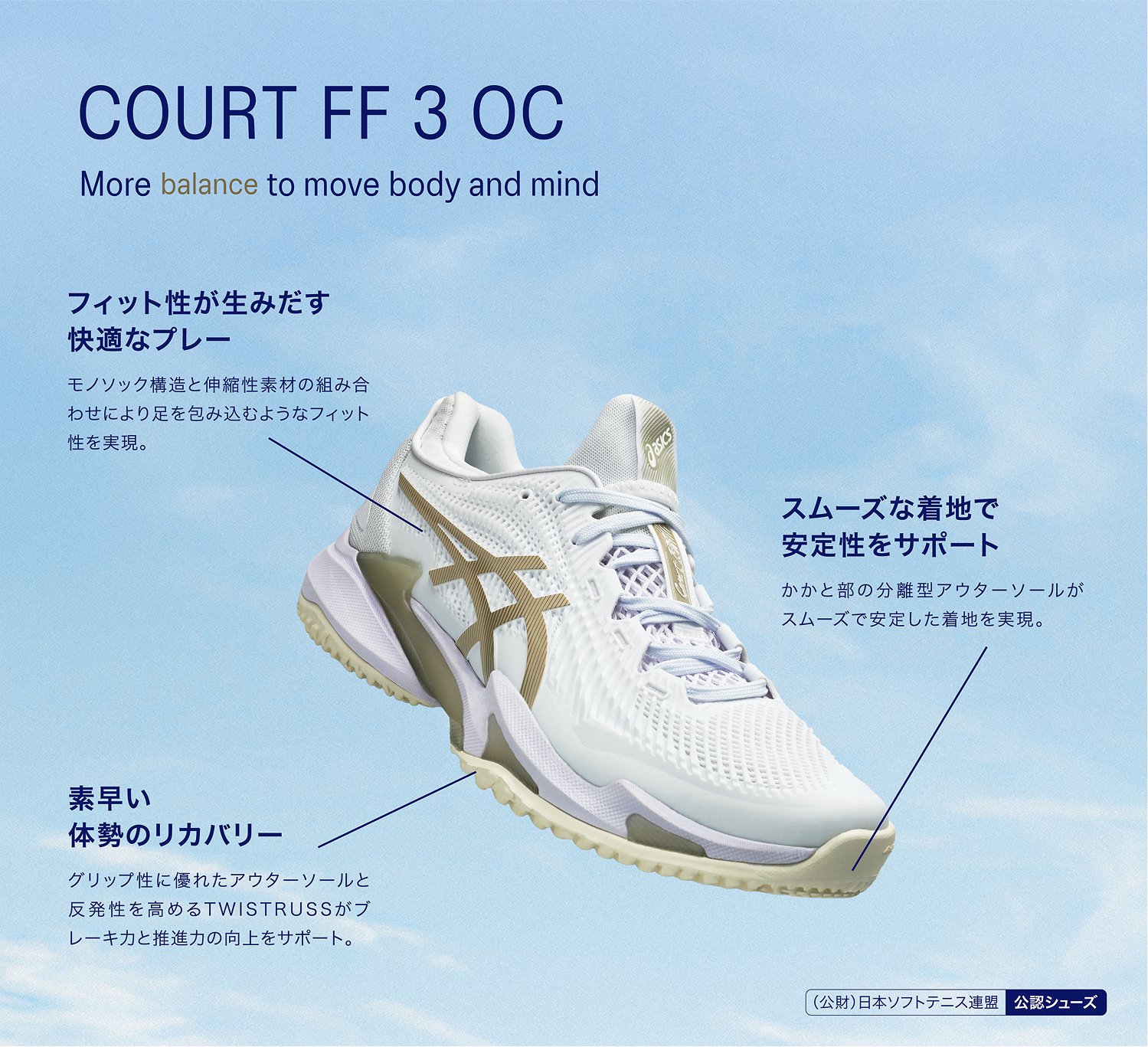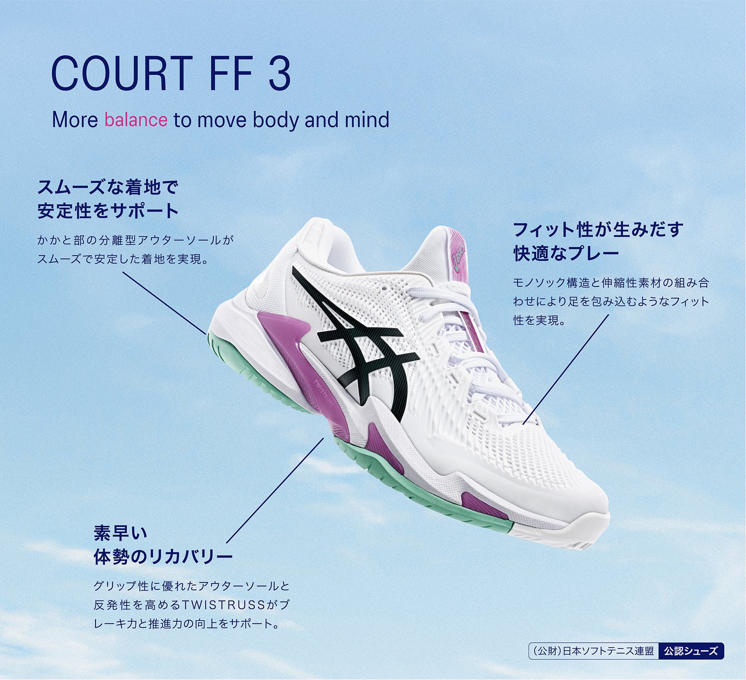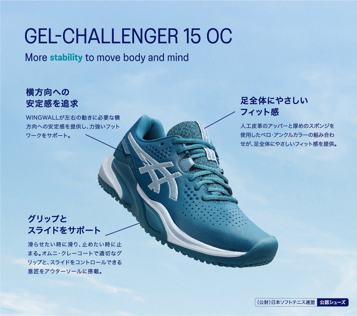 アシックスはテニスプレーヤーの動きを研究し、データをもとにテニスシューズやウエアを開発しています。アシックス独自のテクノロジーでプレーヤーをサポートし、テニスに必要な安定性やクッション性、グリップ性などを発揮します。