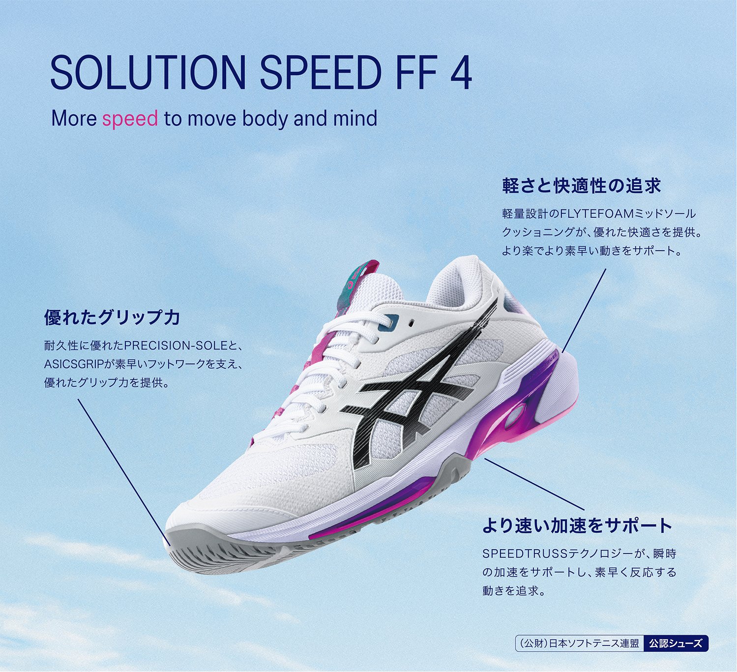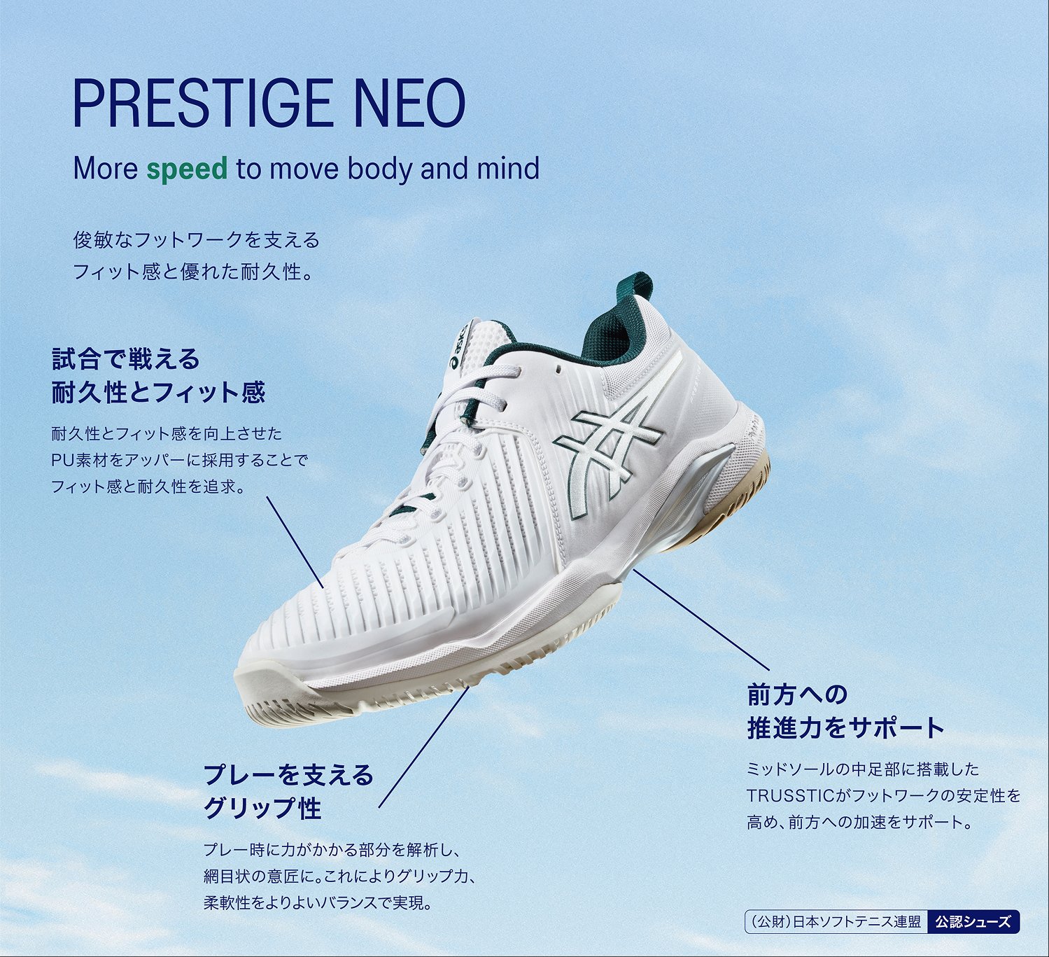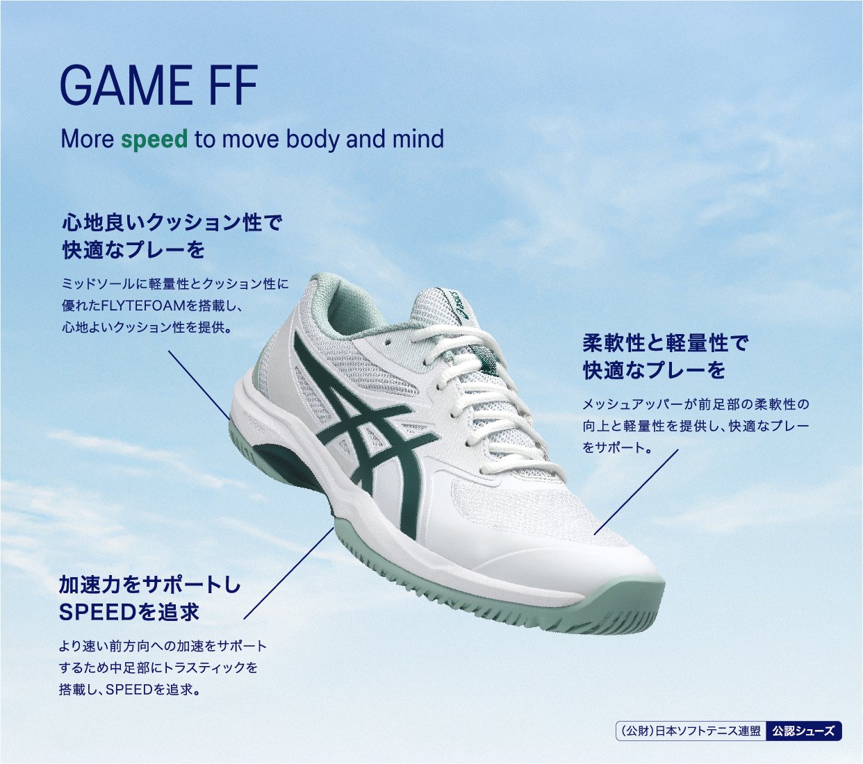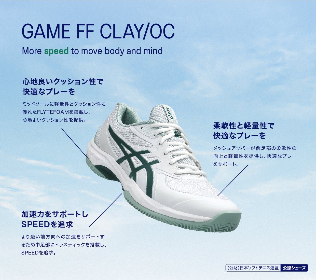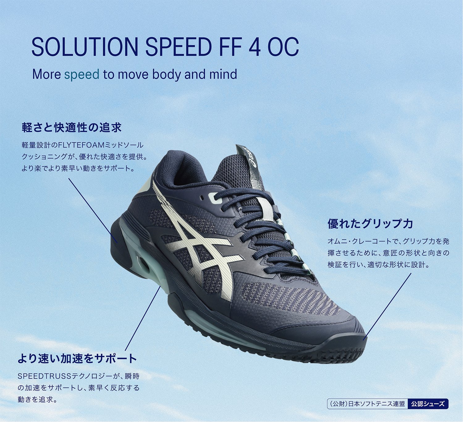 アシックスはテニスプレーヤーの動きを研究し、データをもとにテニスシューズやウエアを開発しています。アシックス独自のテクノロジーでプレーヤーをサポートし、テニスに必要な安定性やクッション性、グリップ性などを発揮します。