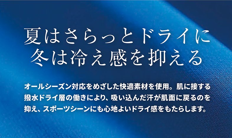 肌面に撥水糸を用いることで肌面に汗を残さず吸い上げ、不快な肌への張り付きを軽減する。