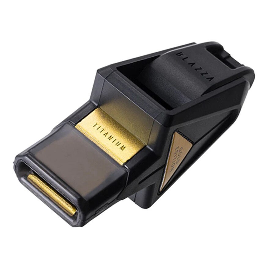 ●FIBAバスケットボールワールドカップ開催を記念して、限定2023個発売:ブラッツァの特長であるチタンのマウスピース部分に、アクセントカラーとしてFIBAバスケットボールワールドカップをイメージした金色を採用しました。販売数量は開催年にちなみ2023個限定で、製品には「0001」から「2023」番まで、金色のシリアルナンバープレートが貼られています。ベースとなるブラッツァは、2011年に発売したバスケットボール審判専用ホイッスルで「立ち上がりの強い、太く切れのある音」をバスケットボール専用にチューニングしています。また、ゲーム中ホイッスルをくわえ続ける審判のために、プラスチック本体にチタンのマウスピースフレームを接合し、柔らかいスチレン系エラストマーで包み込んだハイブリッド構造を採用しています。ブラッツァはFIBA国際バスケットボール連盟のほか、B.LEAGUEやWリーグの公式用具として採用されており、世界中の審判の方にご愛用いただいてます。