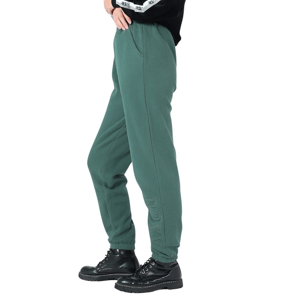 ●定番シルエットのスエットパンツ。裏起毛でやわらかく暖かさも抜群です。左裾には裏毛の裏面を使ったアップリケで、ROXYロゴを大きめにあしらいました。フロント左右にポケット、ウエストは紐で調節できる仕様です。