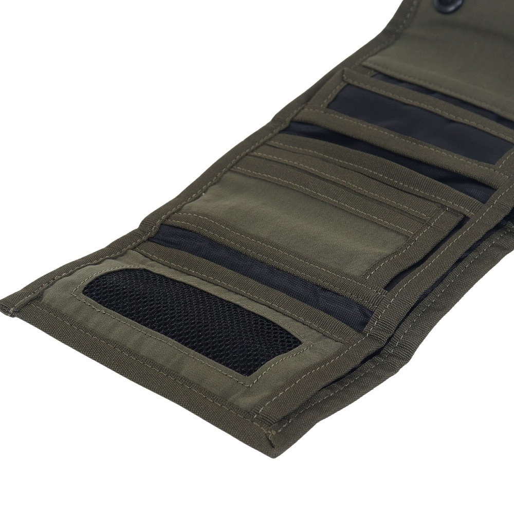 ●内側は総裏地付きで、札入れ、ベルクロ付きコインポーチ、カード入れ2つ、メッシュインサート付きスリップポケット、カードポケットとコインポケットの後ろにさらに2つの隠しコンパートメントがあります。