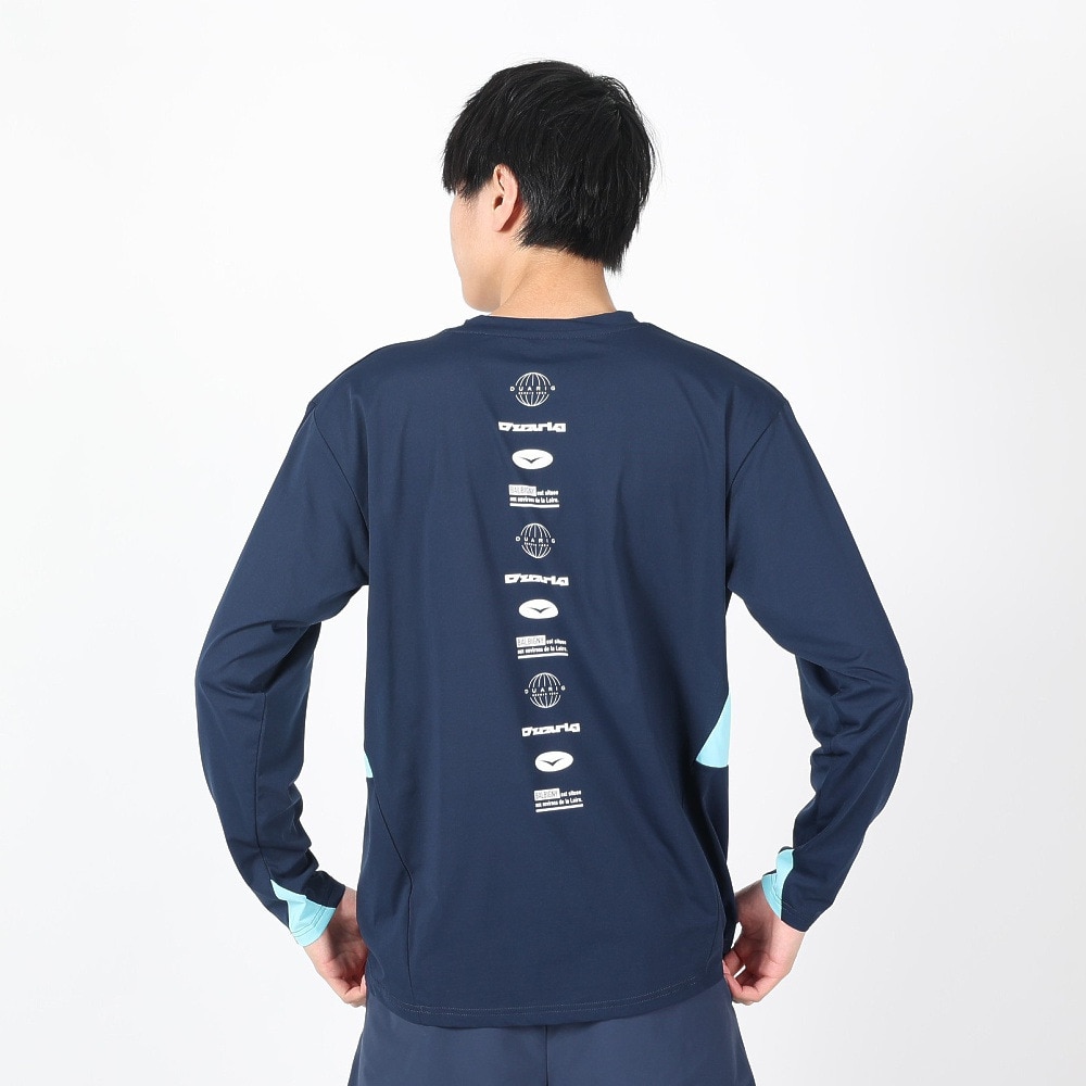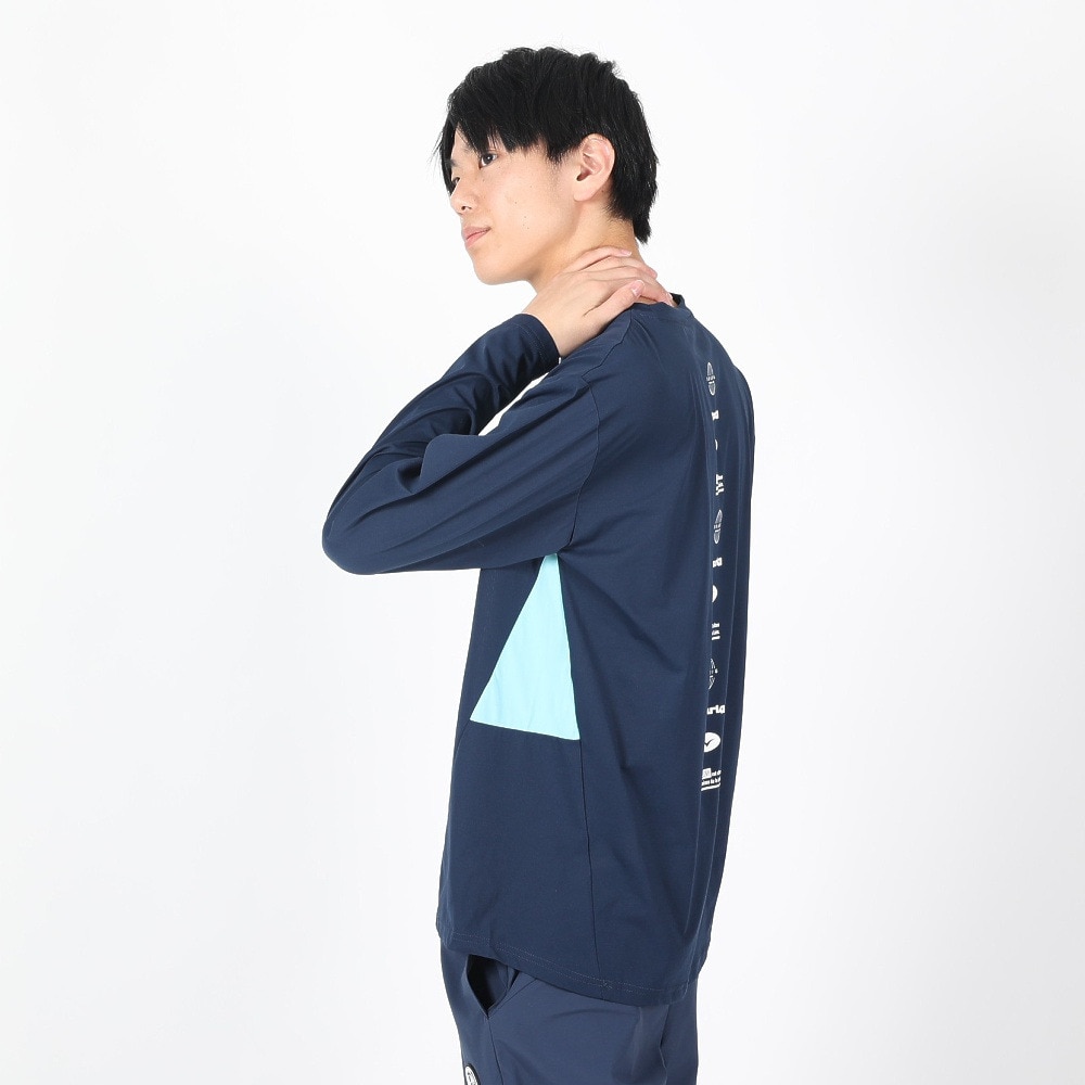 ●吸水速乾機能がありマットなストレッチ素材。前後身頃ロゴプリント、配色切替。消臭糸を部分的に使用した長袖プラクティスTシャツ.
