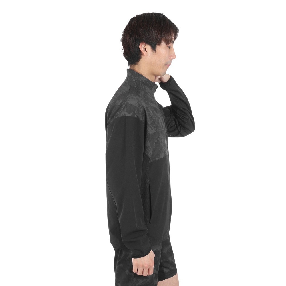 ●部分的にプリント生地を使用したスタンドカラーフルzipジャケット。動きやすい軽量ストレッチ素材を使用。さらに絶耐撥水加工により雨天のトレーニングにも対応しています。